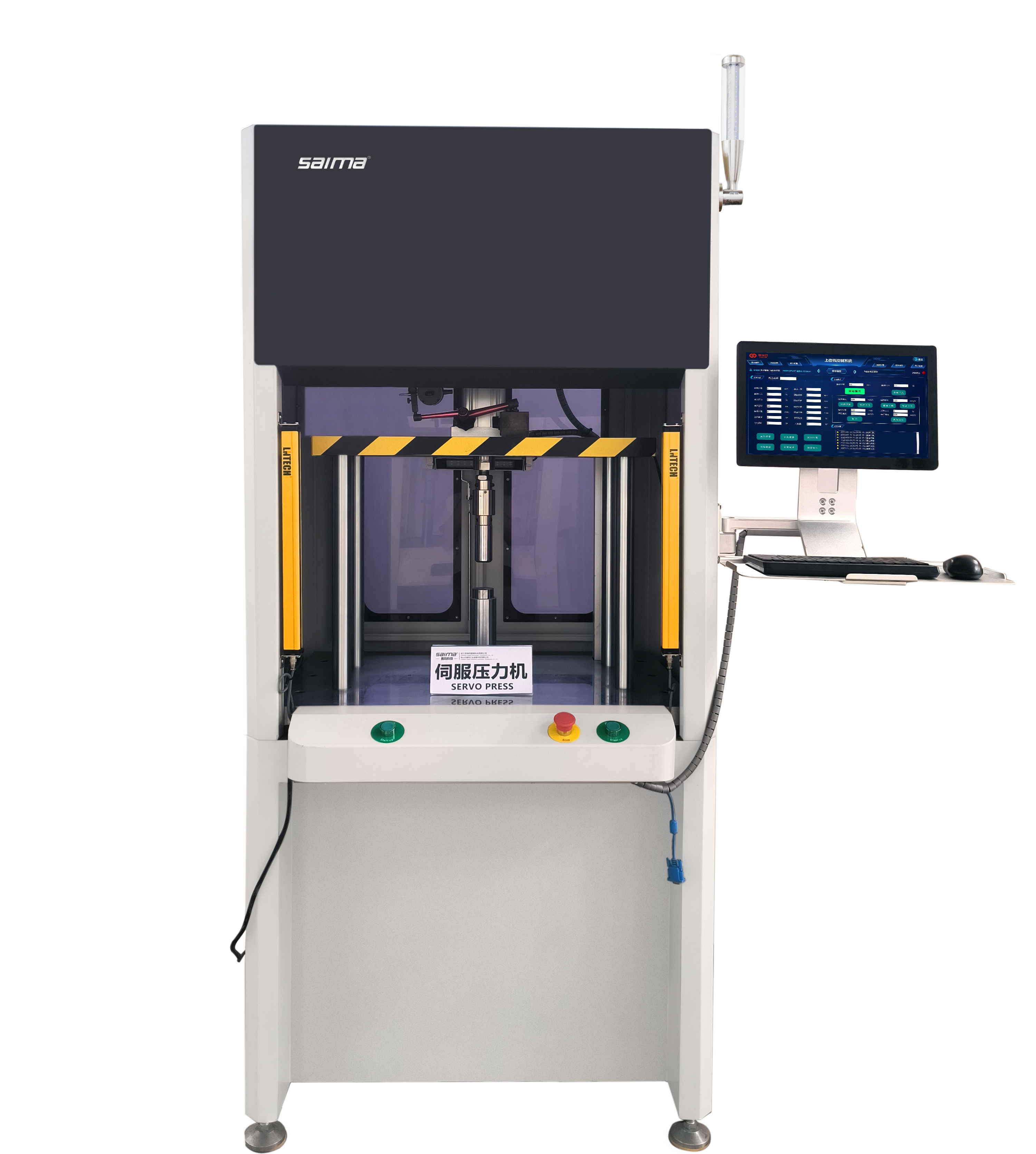 伺服壓力機是采用具有 PID 防過沖(過壓)功能的伺服電機系統(tǒng)作為驅(qū)動的動力源,結(jié)合復(fù)雜多元化電氣系統(tǒng)的完美控制及機械的精確動作,通過高精度研磨滾珠絲杠把回轉(zhuǎn)力量改變?yōu)榇怪狈较蜃鲋本€運動轉(zhuǎn)換而來,依靠裝載于驅(qū)動部位前端的壓力傳感器監(jiān)控管理壓力,依靠編碼器控制管理位置,再加上伺服電機全過程運轉(zhuǎn)數(shù)字化閉環(huán)控制,同時向工作對象施加壓力,從而使壓裝機達到加工柔性化、智能化目的的裝置,能隨時精確控制,壓裝壓力/停止位置/壓裝速度/壓裝時間,能夠在壓力裝配作業(yè)中實現(xiàn)壓裝力與壓入深度的全過程閉環(huán)控制,集預(yù)裝、定位、壓裝、裝配、測量、統(tǒng)計、分析、糾錯、保護、反饋、更新于一體,全面詮釋了精密壓裝領(lǐng)域的各個要點,具備超程、超載、超設(shè)定等報警功能,采用友好人機界面的大尺寸觸摸屏直觀易操作,裝有安全光幕及可拆卸式防護網(wǎng),在壓裝過程中如有身體部位伸入壓裝區(qū)域壓頭將自動返回保證操作安全。